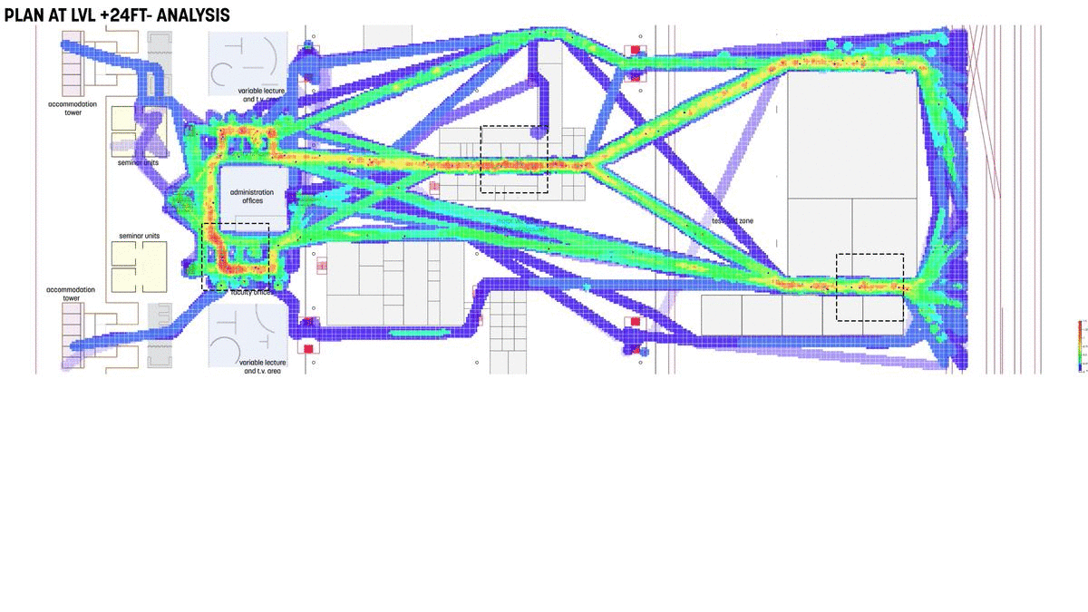 The network is full of calculated uncertainty, providing users with the freedom to make decisions on their feet- to move in non-prescribed ways from one point to another. The existing rail lines and roadways are fixed, but the rest is not strictly determined. In a way, it accommodates change and transformation. By leaving gaps in the network's structure, there is support for endless invention and reconfiguration. The mega structural framework creates a network that is constrained. There is flexibility at the metropolitan scale, adaptability at the scale of the individual.