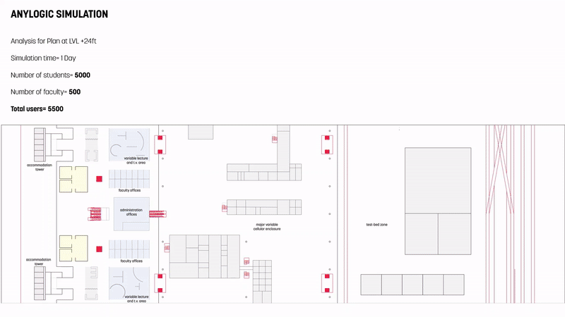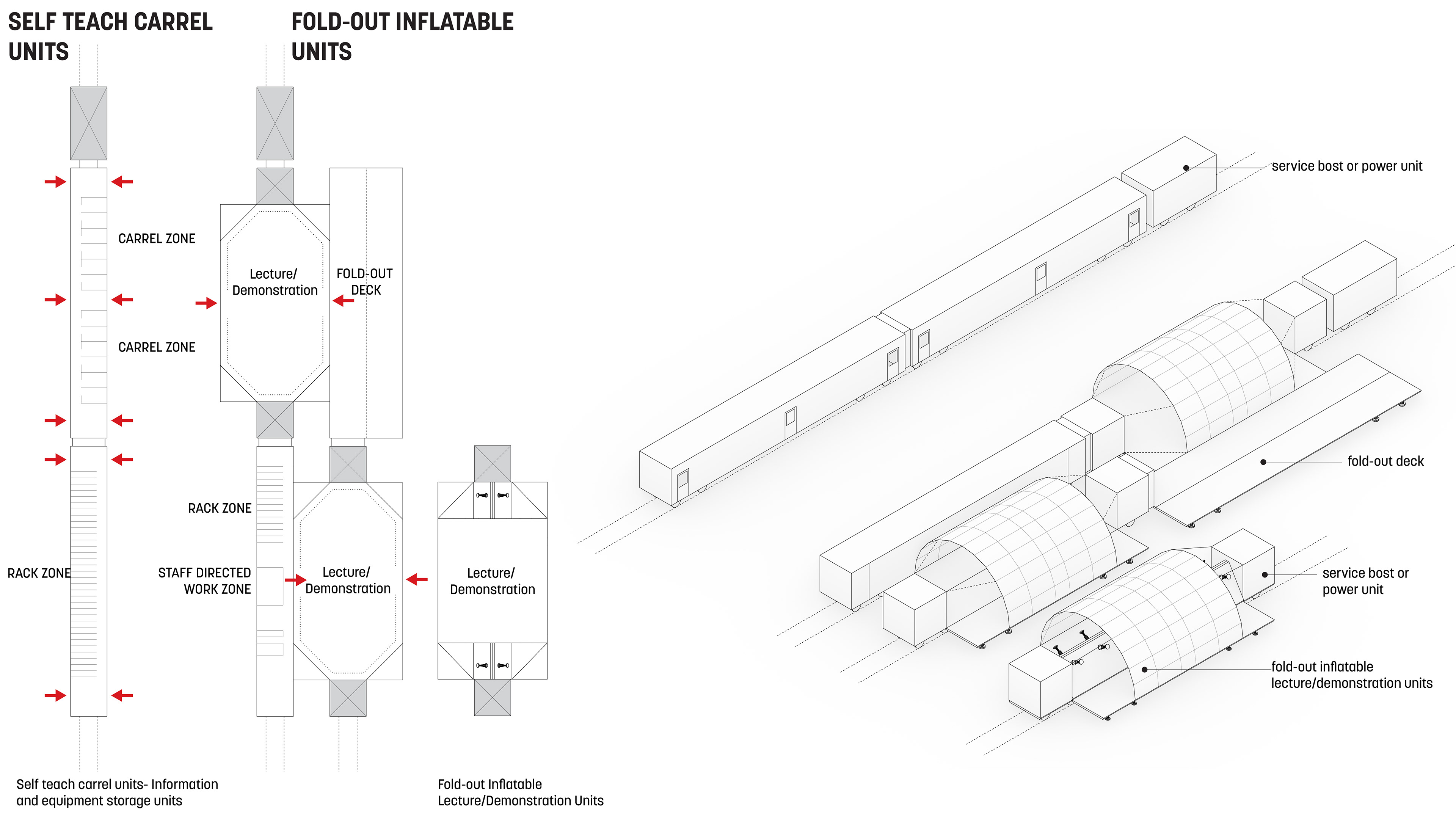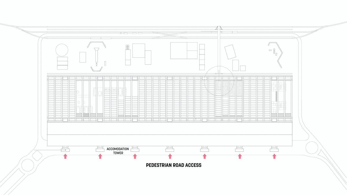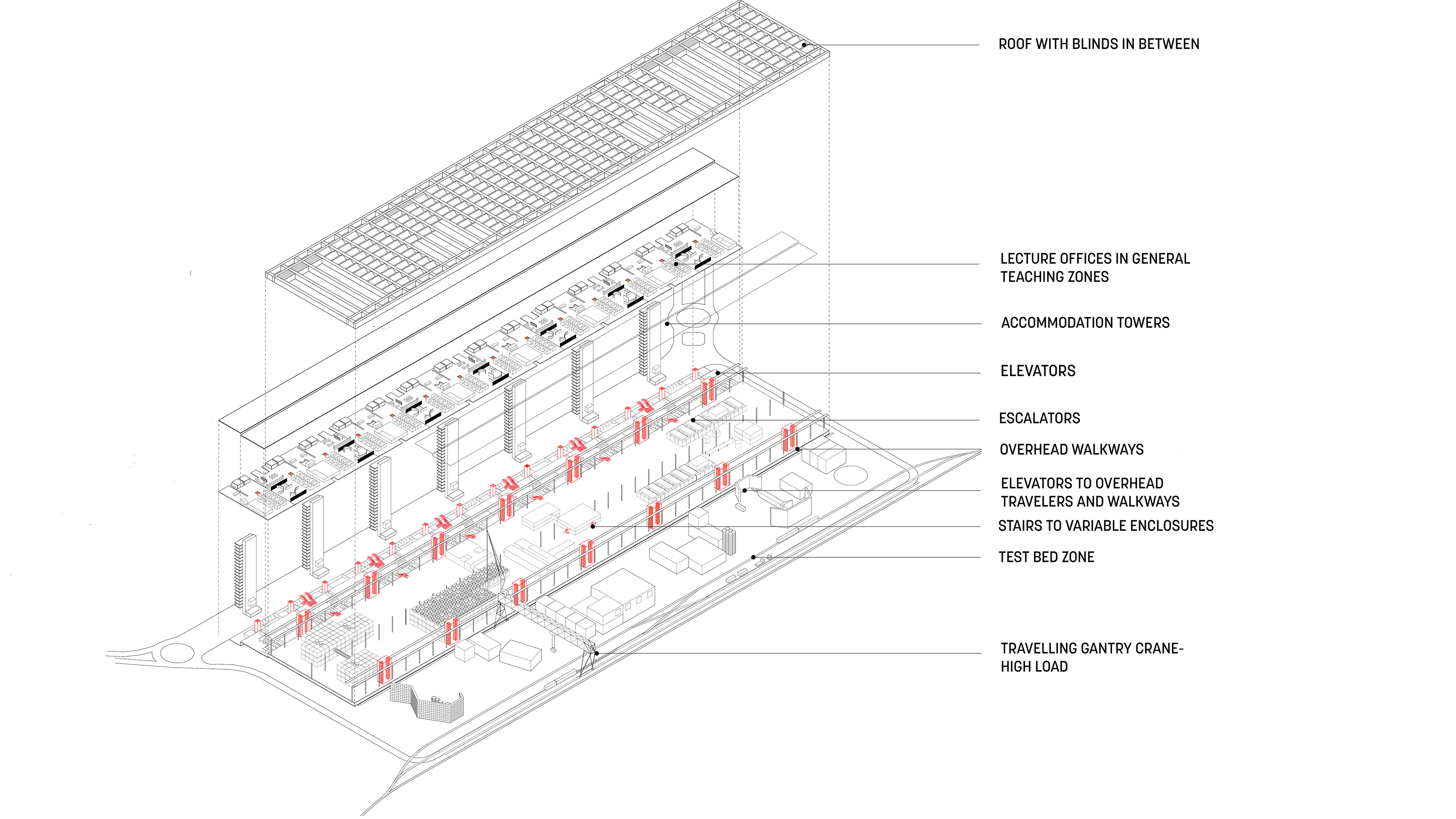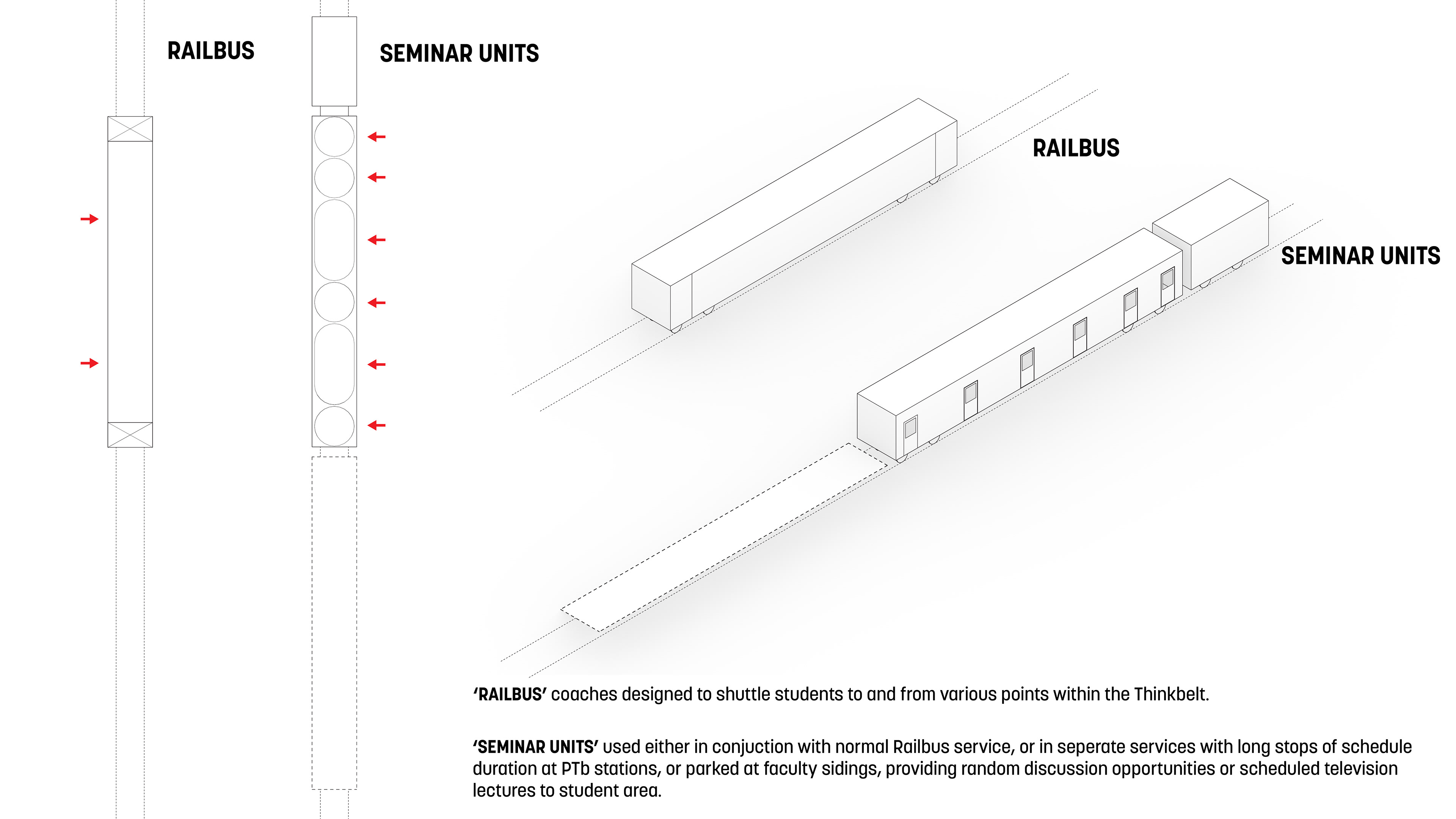 It was not a single “building”, but a network of mobile classrooms and laboratories placed on the existing rail lines to move from place to place, from modular housing to administrative units to a library to onsite factory to computer center. This movement allowed for many variations within the system by permitting present and future configurations to be arranged and reassembled when the needs changed. There were to be three major transfer points, which formed a triangle from Pitts Hill to Madeley to Meir, spreading 100 square kilometers, encompassing all the towns inside as part of the institution. By taking advantage of the compartmentalization of rail cars, class rooms and laboratories could be linked to form larger units, with the largest lecture spanning across the three parallel rails joined by inflatable walls and portable decking