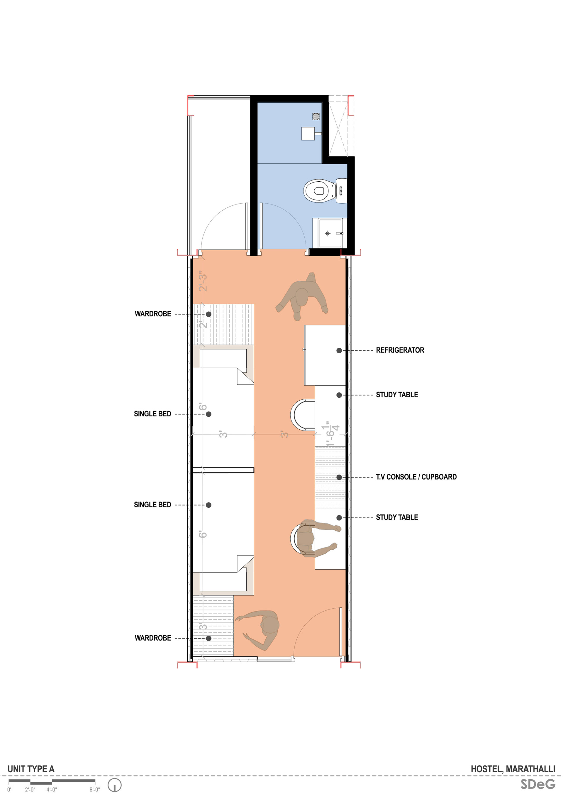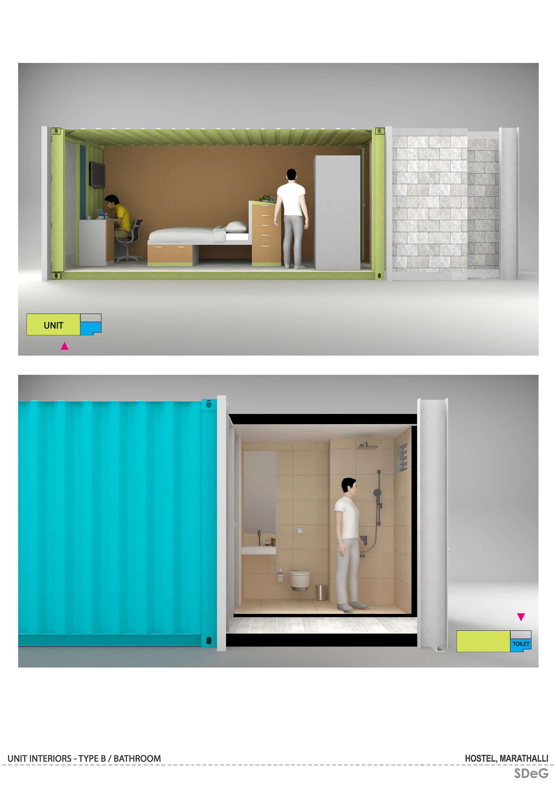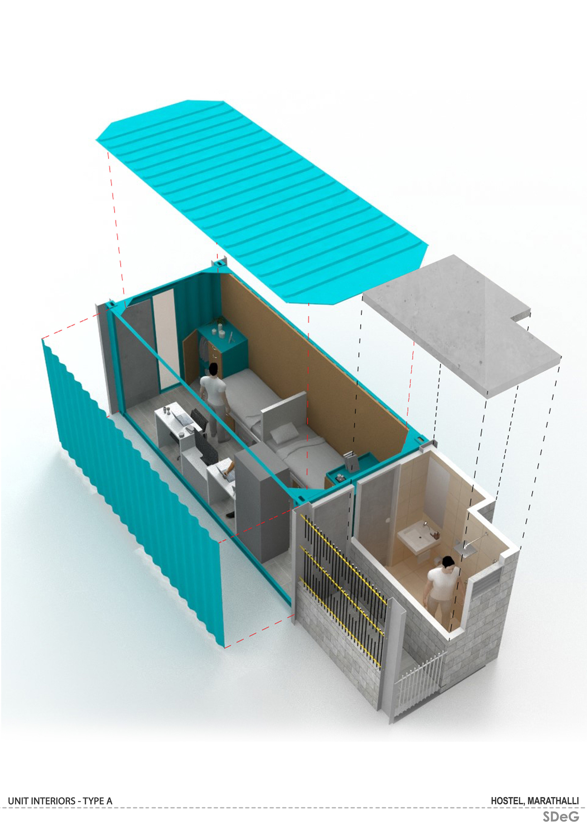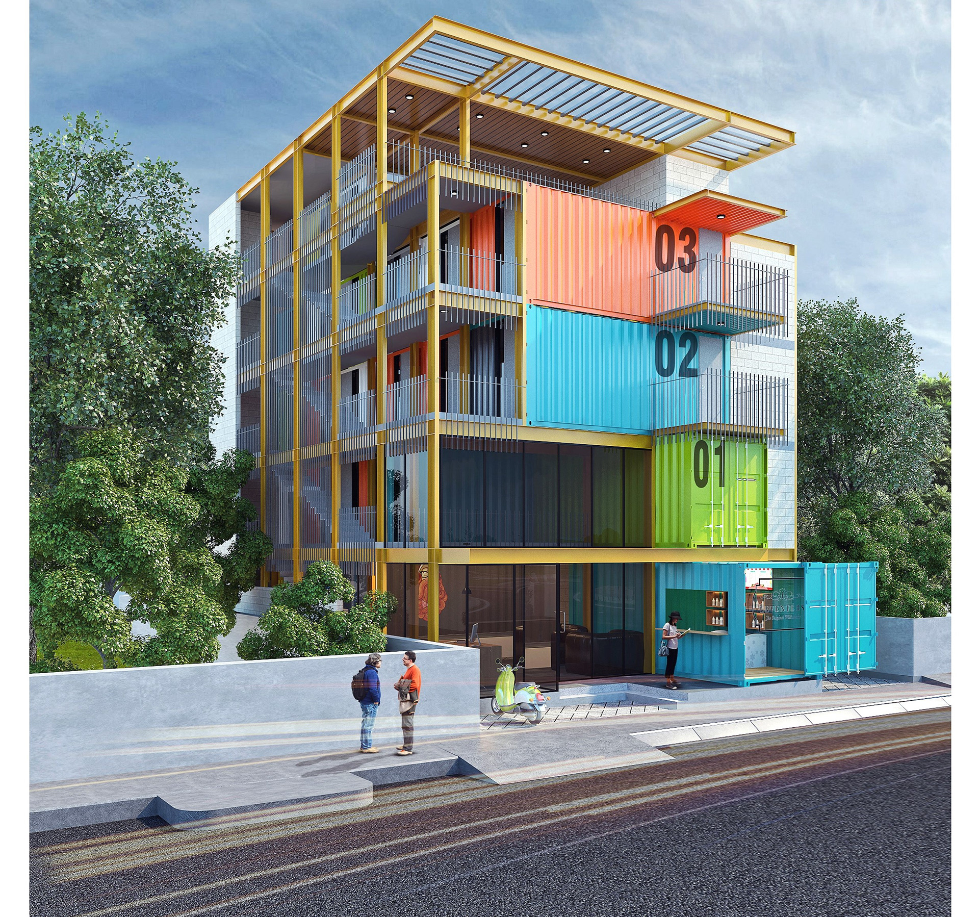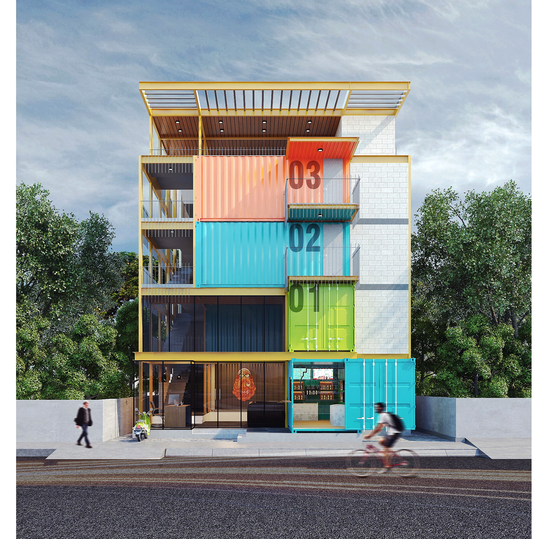 The container hostel is a 5 story building with 22 rooms located in a busy neighborhood. The 1980 square foot structure aims to meet the growing demand for residential property in the area and creates a landmark building that attracts diverse individuals. The building is designed entirely from old brightly painted shipping containers, transformed into quirky industrial abodes, connected by semi open- air walkways.