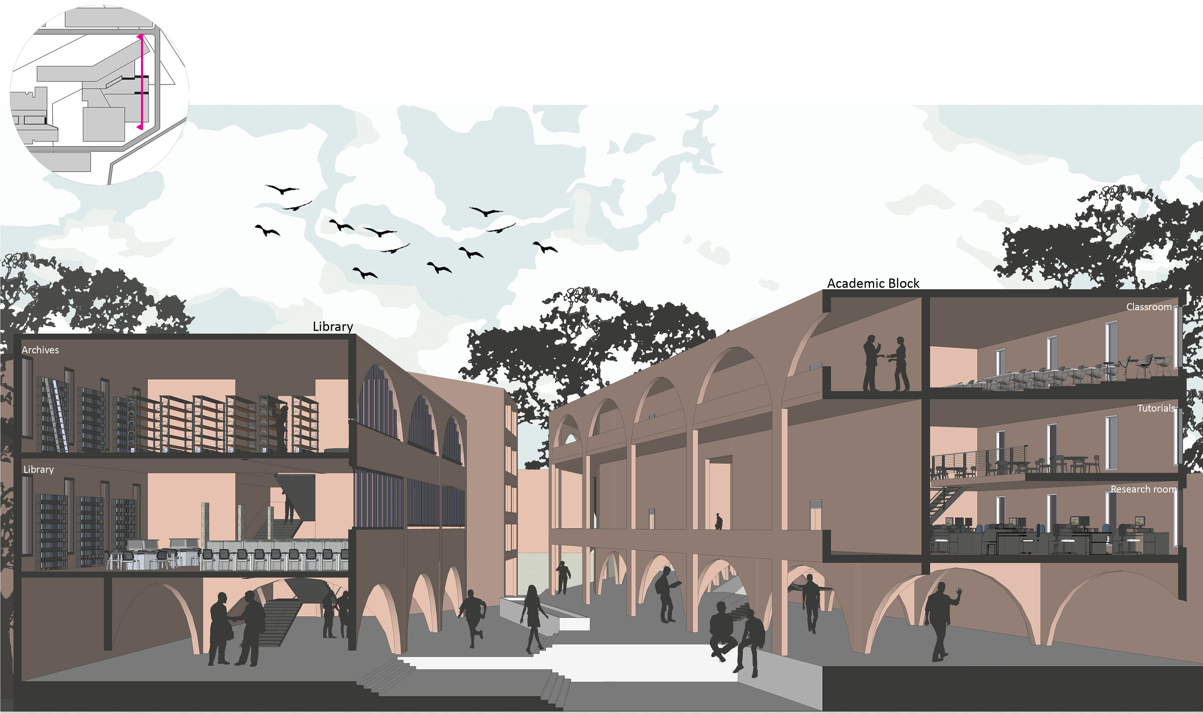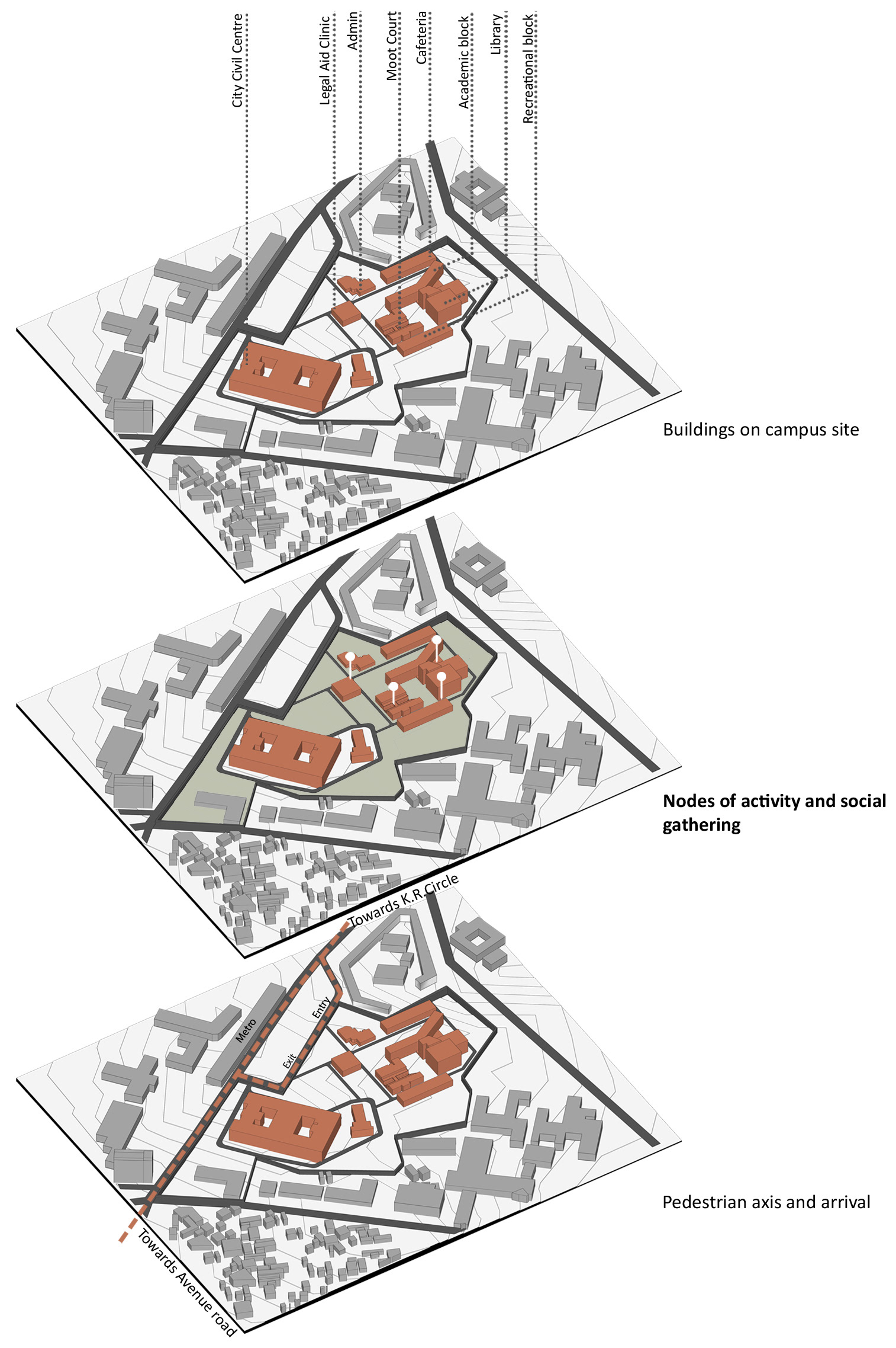 Nodes of activity are located at key areas along the site. These nodes are areas of the campus that express the collaborative social learning environment and serves as the anchor for student activity. The building emphasizes the physical and visual connection between the indoor and outdoor environment. Facades are articulated with large geometrical openings and circulation is brought to the edges of the building wherever possible.
