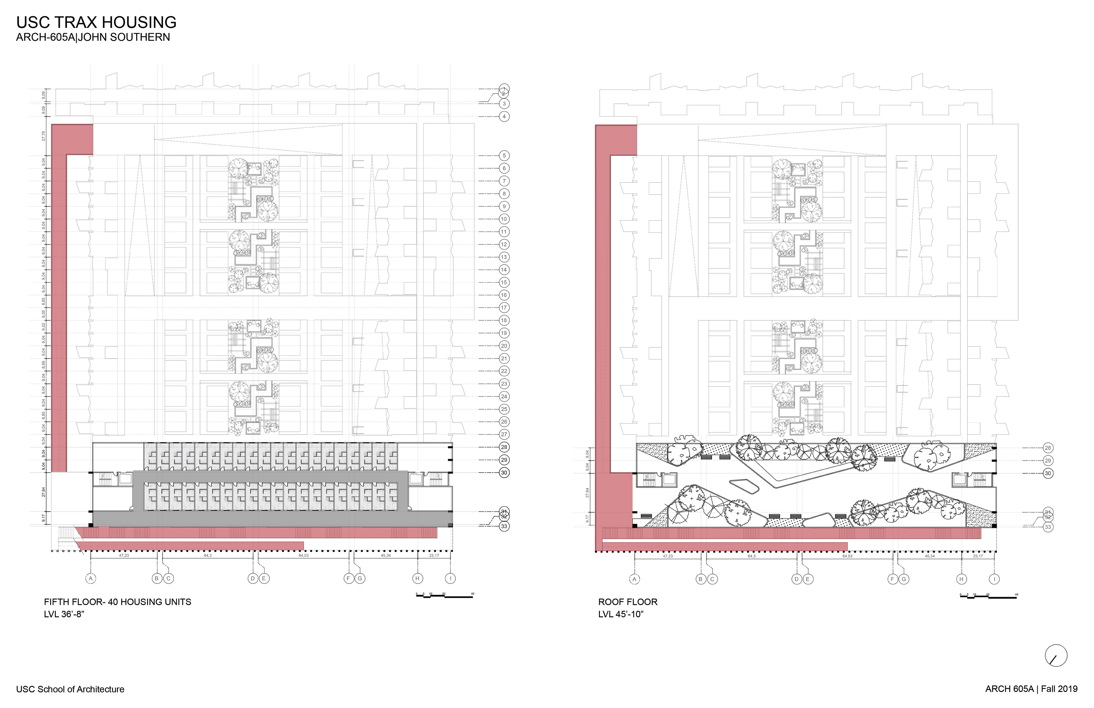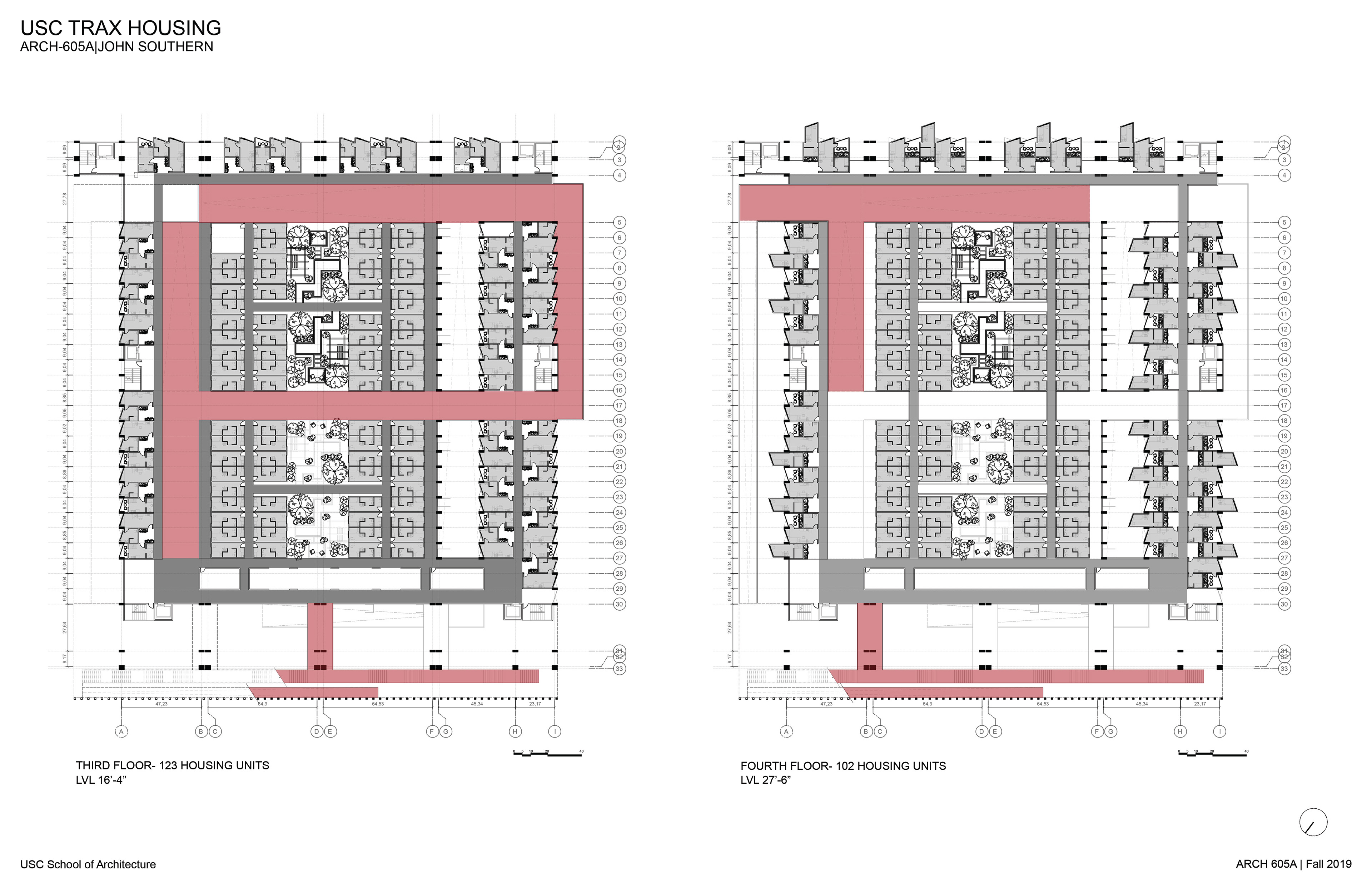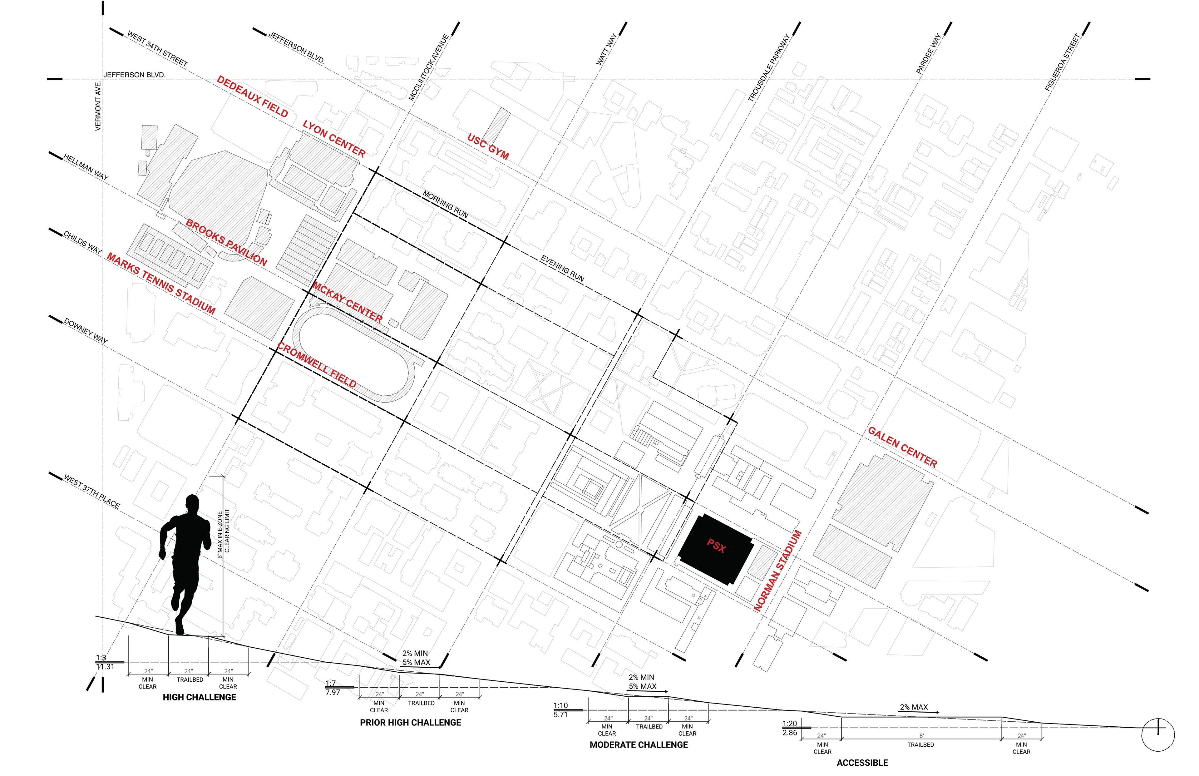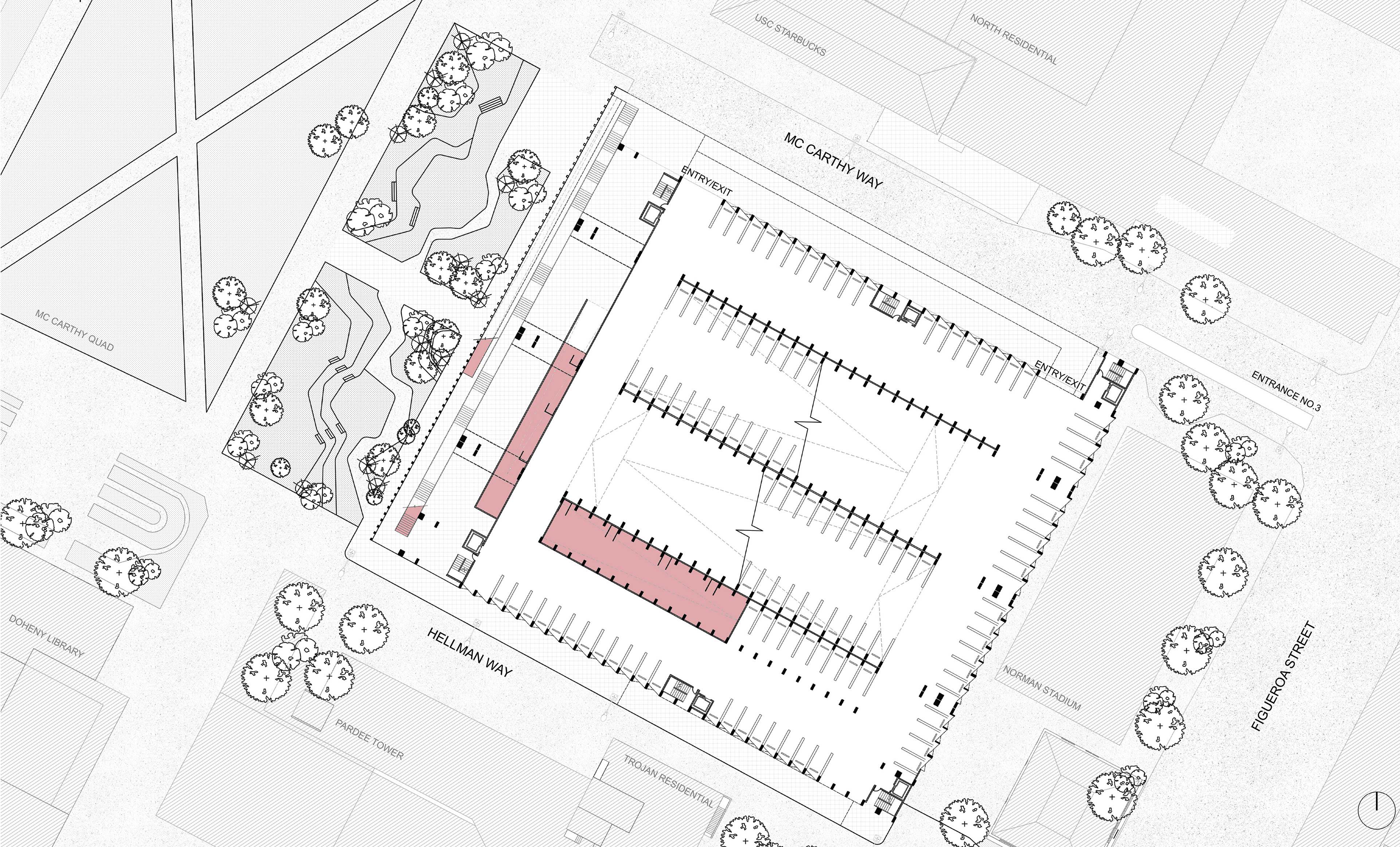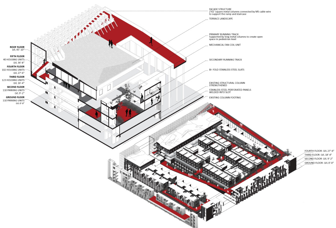 Parking garages are prime sites for redevelopment at high density in Downtown L.A. and on the USC campus. The design primarily investigates programs contributing toward physical life improvements, improved social interaction and academic contribute to lifestyle enhancements within the USC community. USC TRAX delivers layered series of domestic and leisure programs using the running track as an organizational armature. The design transforms the existing parking structure by slicing, dicing, and coring voids into the building, creating a continuous volume dedicated to the practice of running. There are four tiers of grade on the track, which are based on terrains on the USC campus and area ADA friendly.