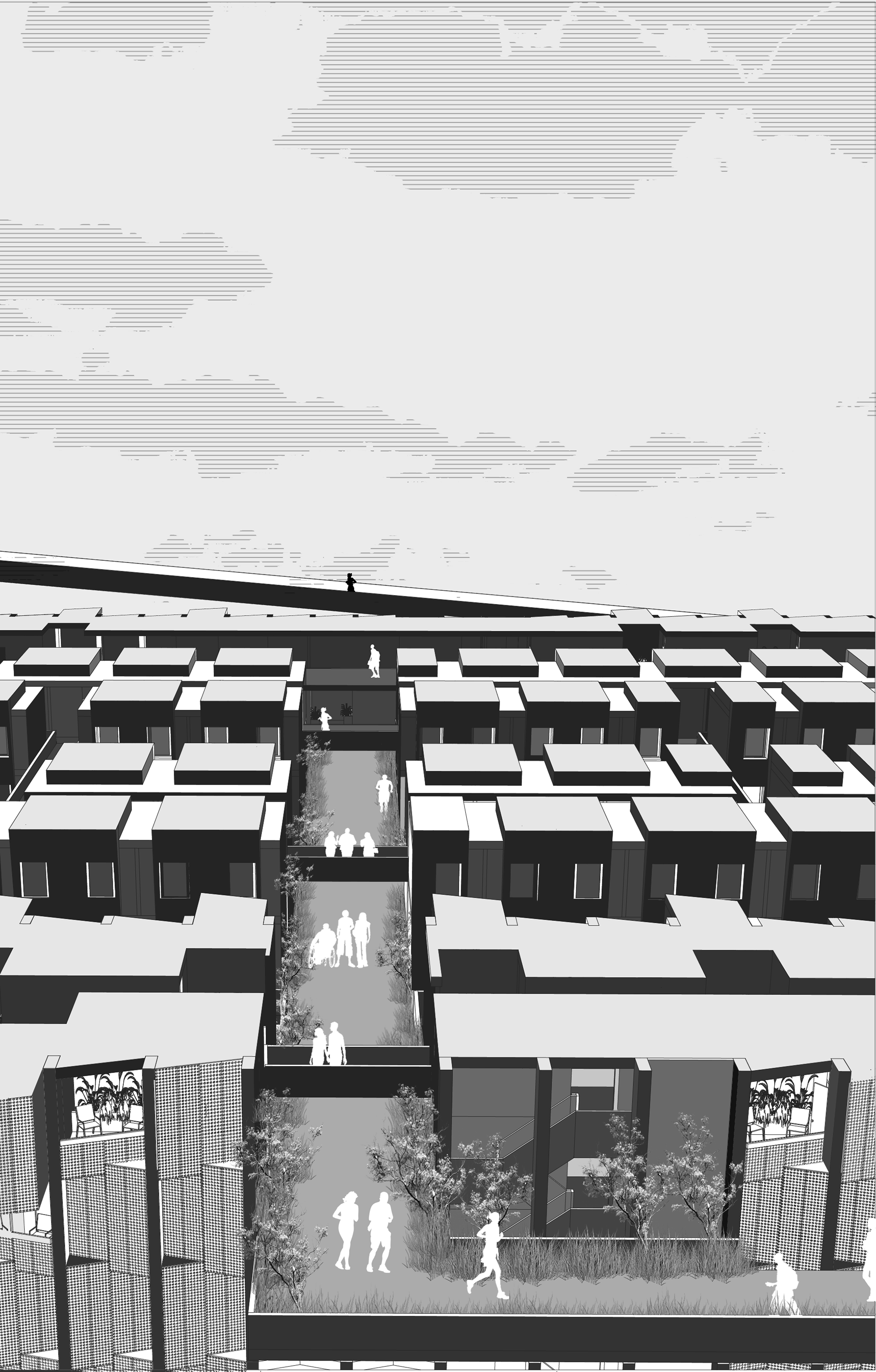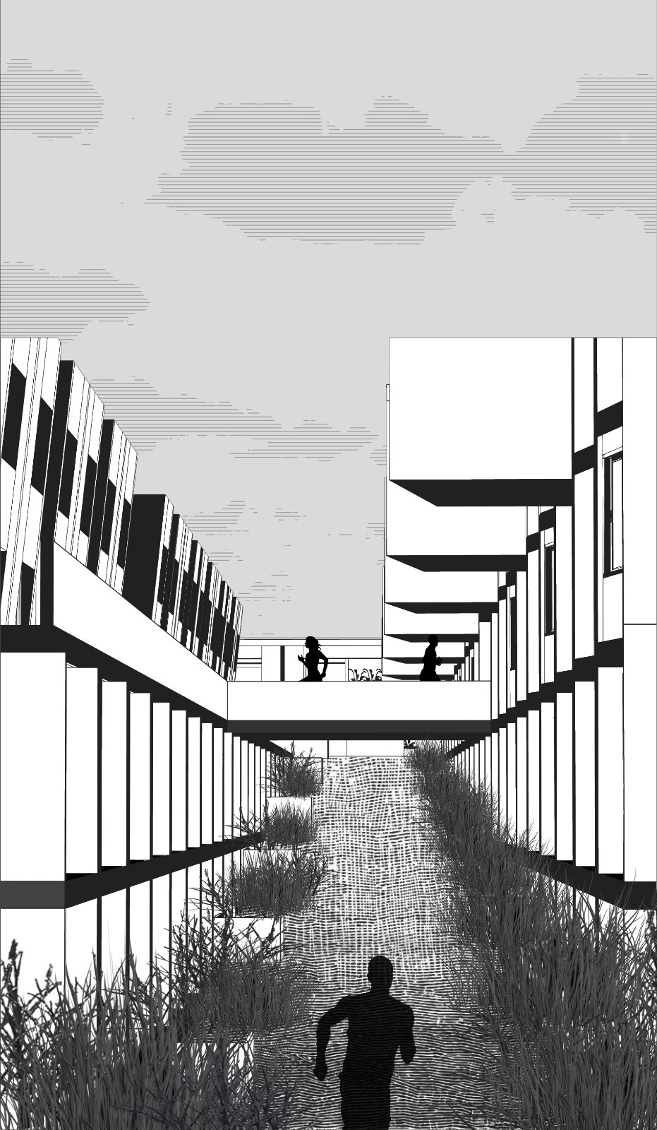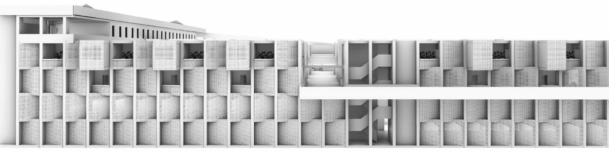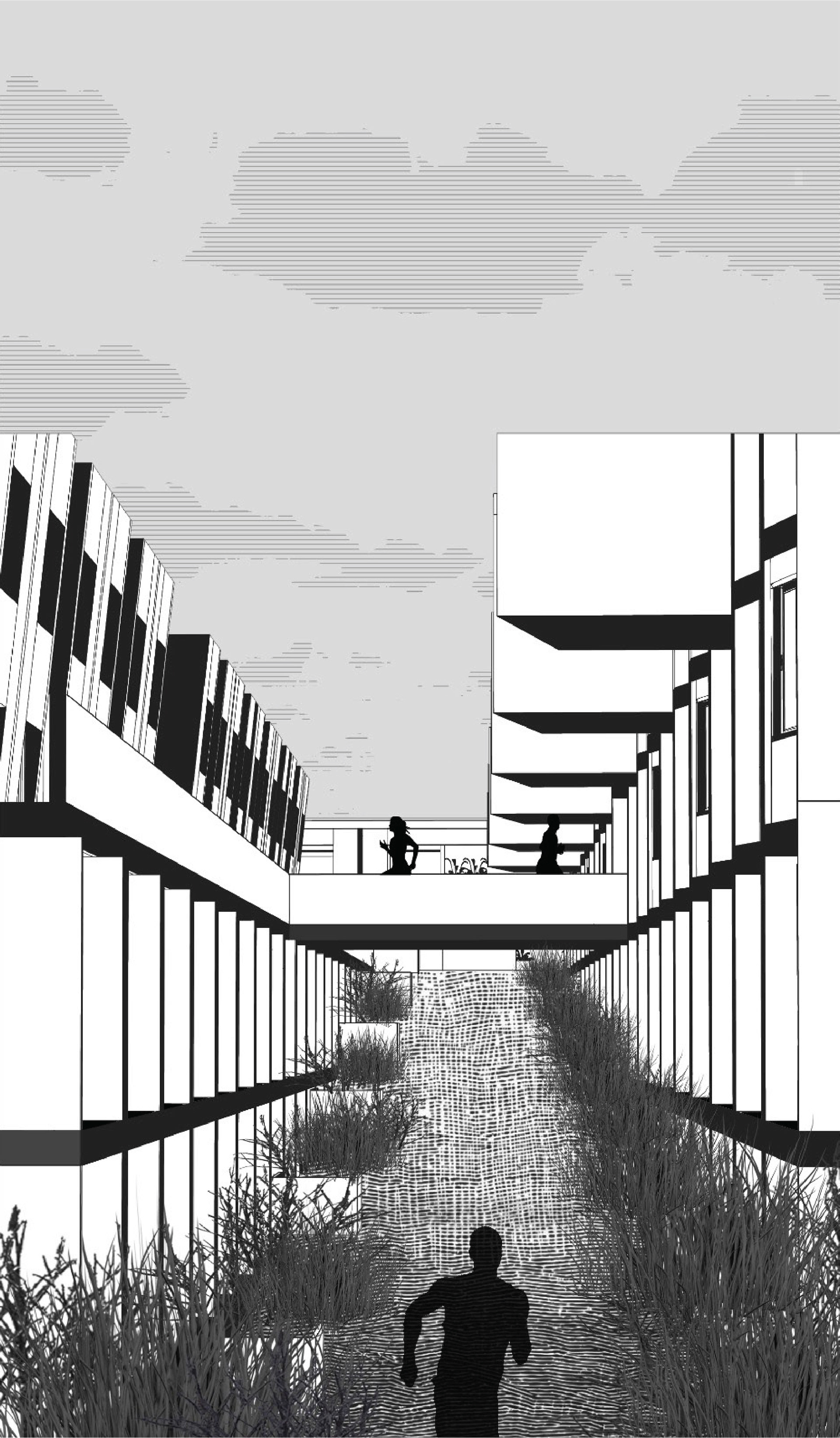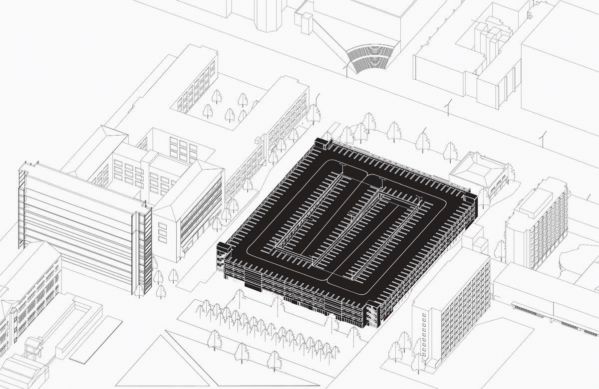 Parking garages are prime sites for redevelopment at high density in Downtown L.A. and on the USC campus. The design primarily investigates programs contributing toward physical life improvements, improved social interaction and academic contribute to lifestyle enhancements within the USC community. USC TRAX delivers layered series of domestic and leisure programs using the running track as an organizational armature. The design transforms the existing parking structure by slicing, dicing, and coring voids into the building, creating a continuous volume dedicated to the practice of running. There are four tiers of grade on the track, which are based on terrains on the USC campus and area ADA friendly.
